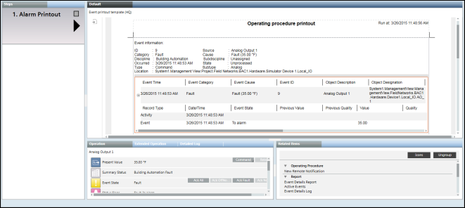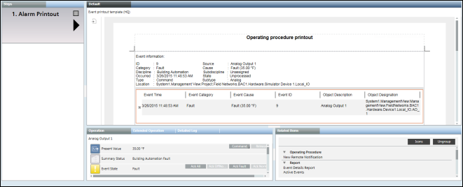 • An Alarm step is added to the operating procedure template and an Event Details report is associated with the step.