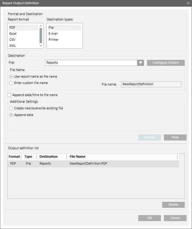 displays the Report Output Definition dialog box that allows you to configure the report output settings.