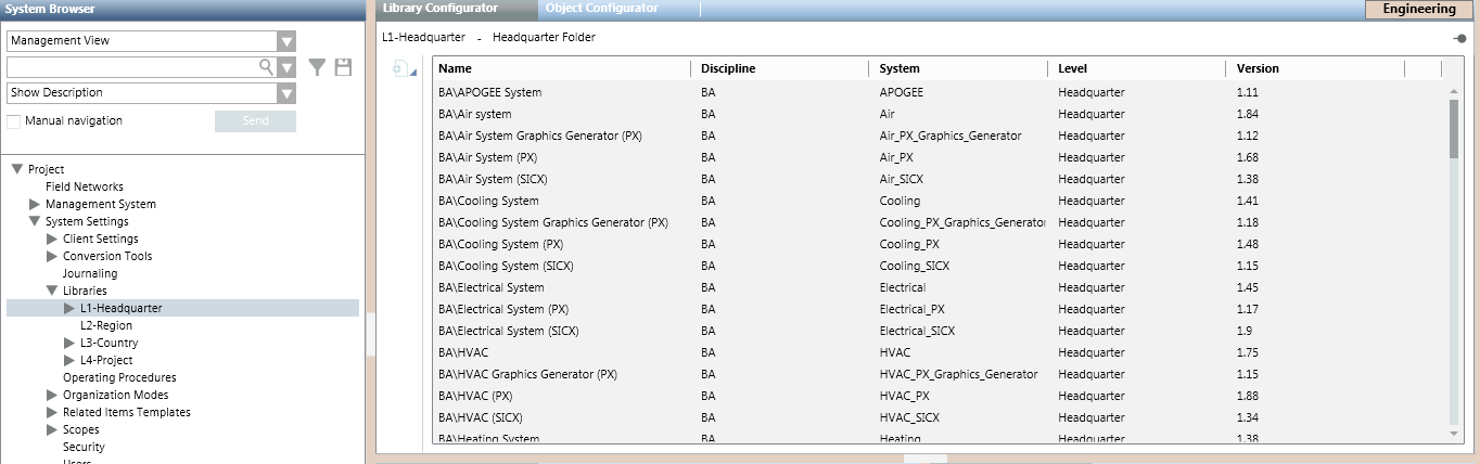 Selecting one of the library levels (L1-Headquarter, L2-Region, L3-Country, or L4-Project) causes the Library Configurator tab to display a list of all the libraries in that level.