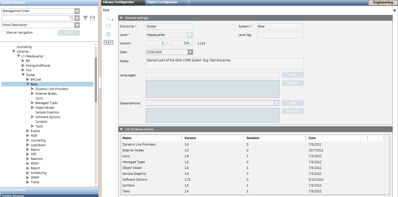 In Engineering mode, when you select an element of a library structure, the Library Configurator tab displays a configuration workspace. The types of controls provided vary depending on the specific level in a library structure that you select: Libraries (main folder), L1, L2, L3 or L4 (library level folders), library, or block.