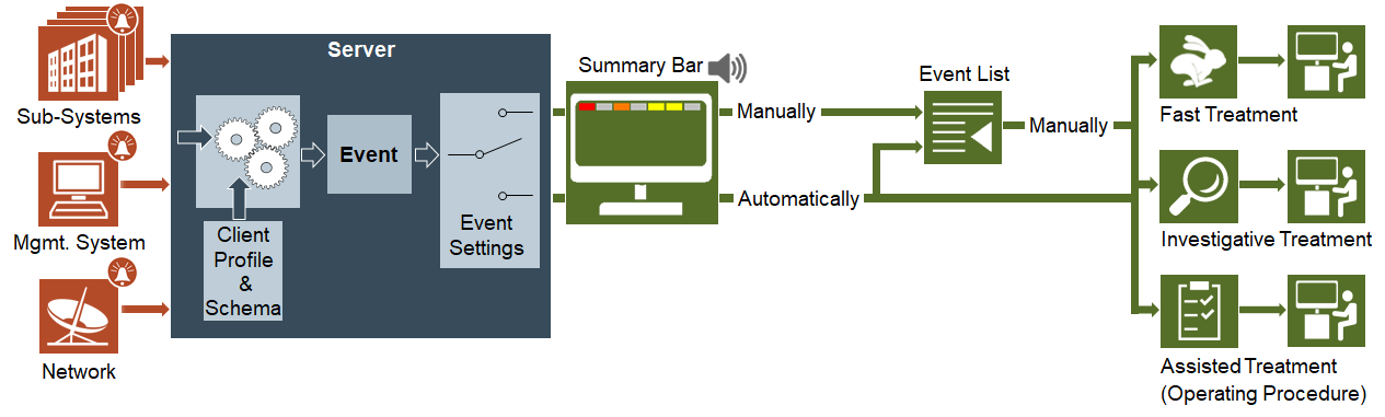 An Alarm is a situation that the operator either needs to be aware of, or needs to respond to. When an alarm is acquired or generated in the management station, it is processed as an Event according to the system settings.