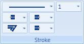 The Stroke group allows you to format an element’s outline by choosing options from a set of stroke-related drop-down menus. You can select the overall type and thickness of the stroke. You can also choose a flat, round, square, or triangle for the starting and ending edge of a line or figure. If the active element has unconnected lines you have the option of setting the end caps for each segment.