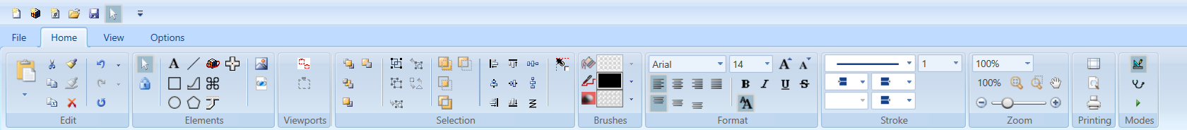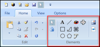 The Elements group options allows you to create and work with graphic elements on the canvas, as well as insert images, animation objects, XAML files, and AutoCAD files.
