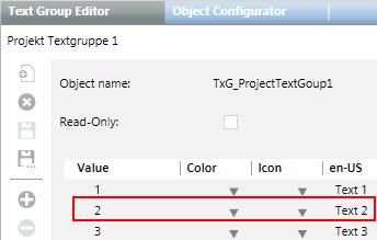 - The object reference is added to the Text field, for example, TxG_ProjectTextGroup.2.