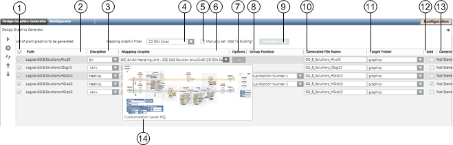 In the Graphics Generator, you select one or more plants, designate one mapping groups for use and start the generation process. The Graphics Generator attempts to select the appropriate graphic elements based on the data point information (carrier of instance designation application name (AN) and function designation Function Name (FN)) and fills out the associated fields with the correct object reference.