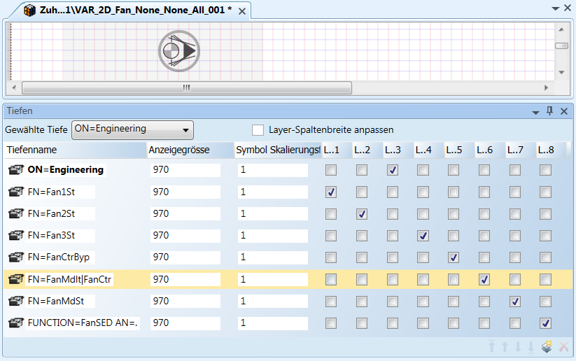 One variant symbol includes information for multiple symbols. The depth determines the assigned function. For two-stage fans, the function name FN=Fan2St is used as identification. It can be extended by simply adding a new layer.