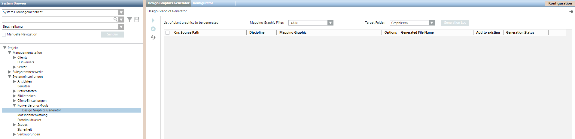 - Select Project > System settings > Conversion tools > Desigo Graphics Generator.