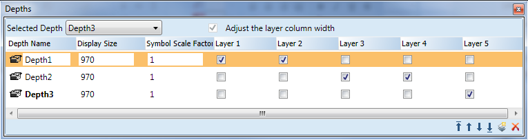 The Depths view allows you create, rename, and delete a depth, re-order multiple depths, and to change the display size and Symbol scale factor properties of a depth. You can view a list of depths associated with the active canvas and move them up or down to order them.