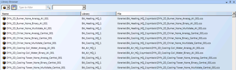In the list view of the Library Browser, the Symbols and graphic templates are listed by Name, Library, and File. A thumbnail preview is not displayed.
