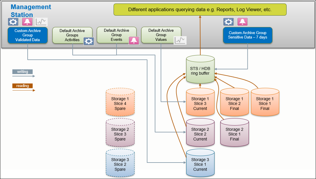 A project can have several archive groups. You can define settings for each archive group separately, whether the data is written to the Short Term Storage (STS) or the Long Term Storage (LTS) (see Configuring History Database in System Browser). Each LTS can have one or more LTS slices. You cannot edit or delete data in the LTS. You can only add data.