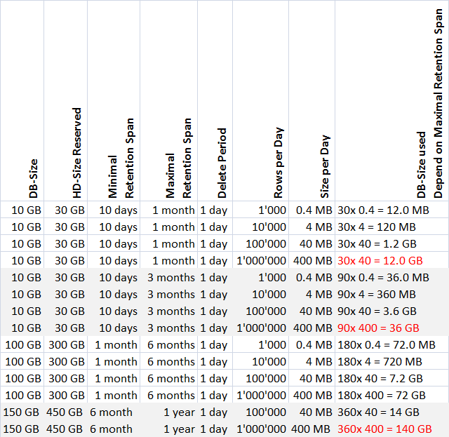 The applied settings depend strongly on the maximum entries per day, data group, legal regulations, and SQL Server used (maximum of 10 GB for SQL Server Express or 250 GB for SQL Server).