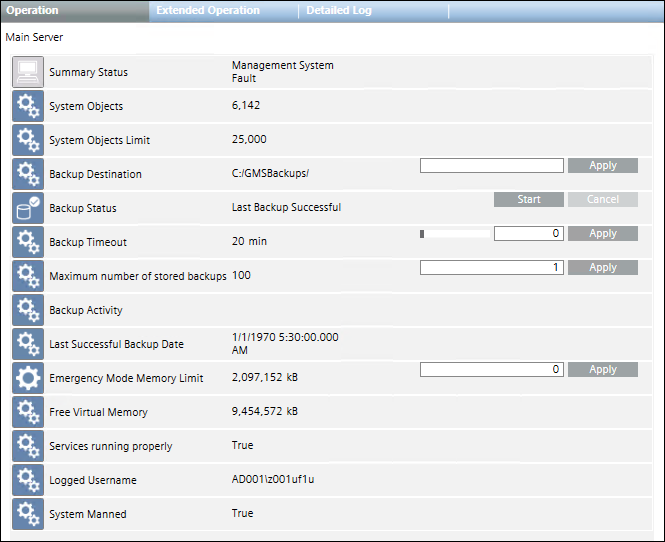 When you select the Main Server object in System Browser, the Operation and Extended Operation tabs in the Contextual pane display the various properties and commands of the Main Server object, which also include those relating to the project backup.