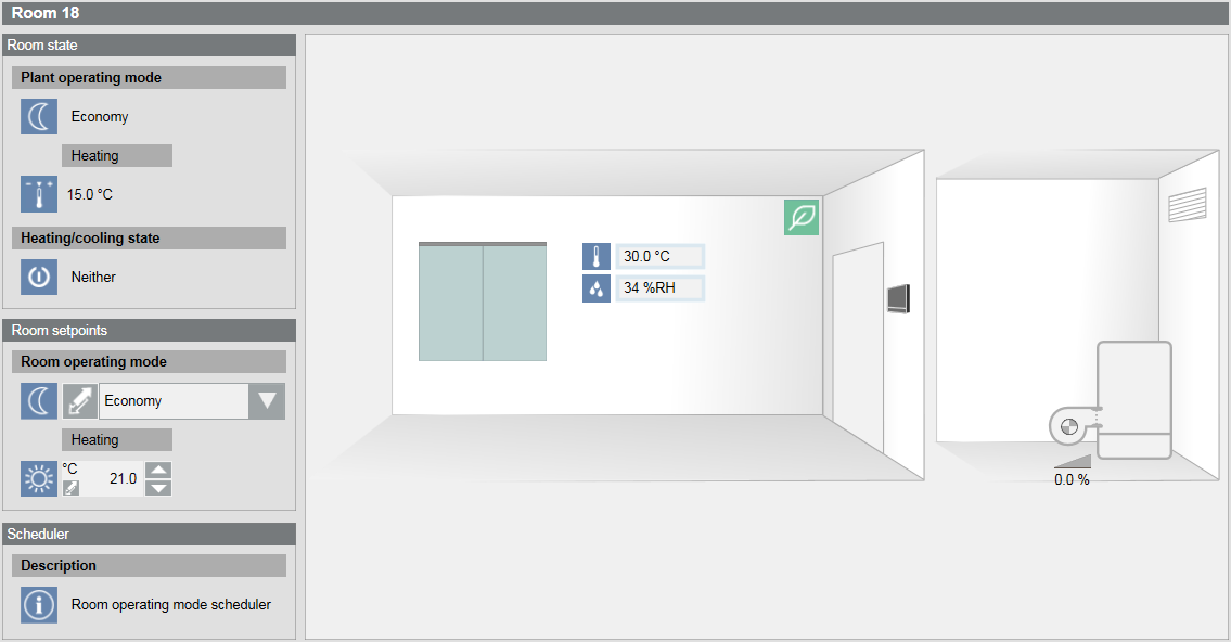 • In the System Browser or floor plan view, select the room to operate. The graphical view is based on the applied configuration.