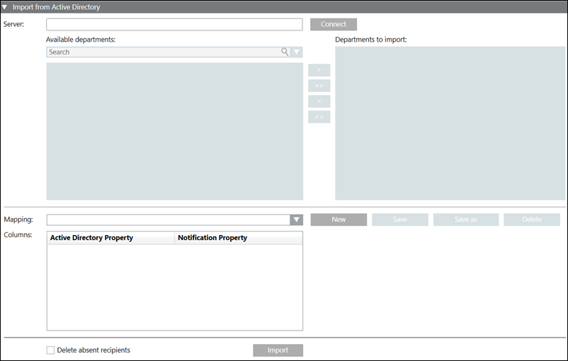 The Import from Active Directory expander allows the user to import a department consisting of recipient users from an Active Directory.