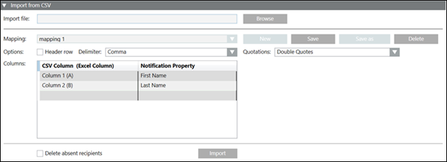 - Delete absent recipients: Deletes the existing recipients which are not present in the CSV file and are imported using identical import type (CSV) and mapping.