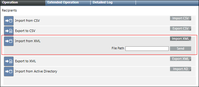 - Import XML: Displays the File Path field and Send button.