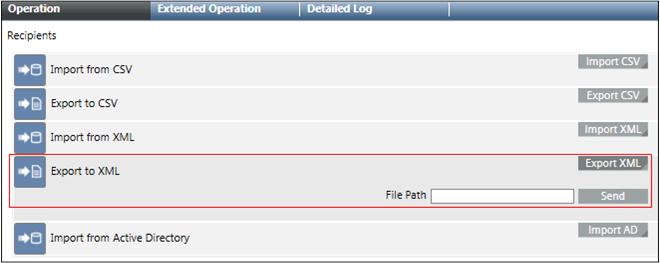 - Export: Exports the selected recipient users to an XML file.