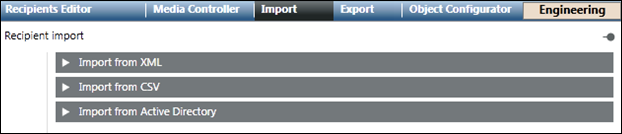 The Import tab allows the import of recipients from XML and CSV files and a department consisting of recipient users from an Active Directory.