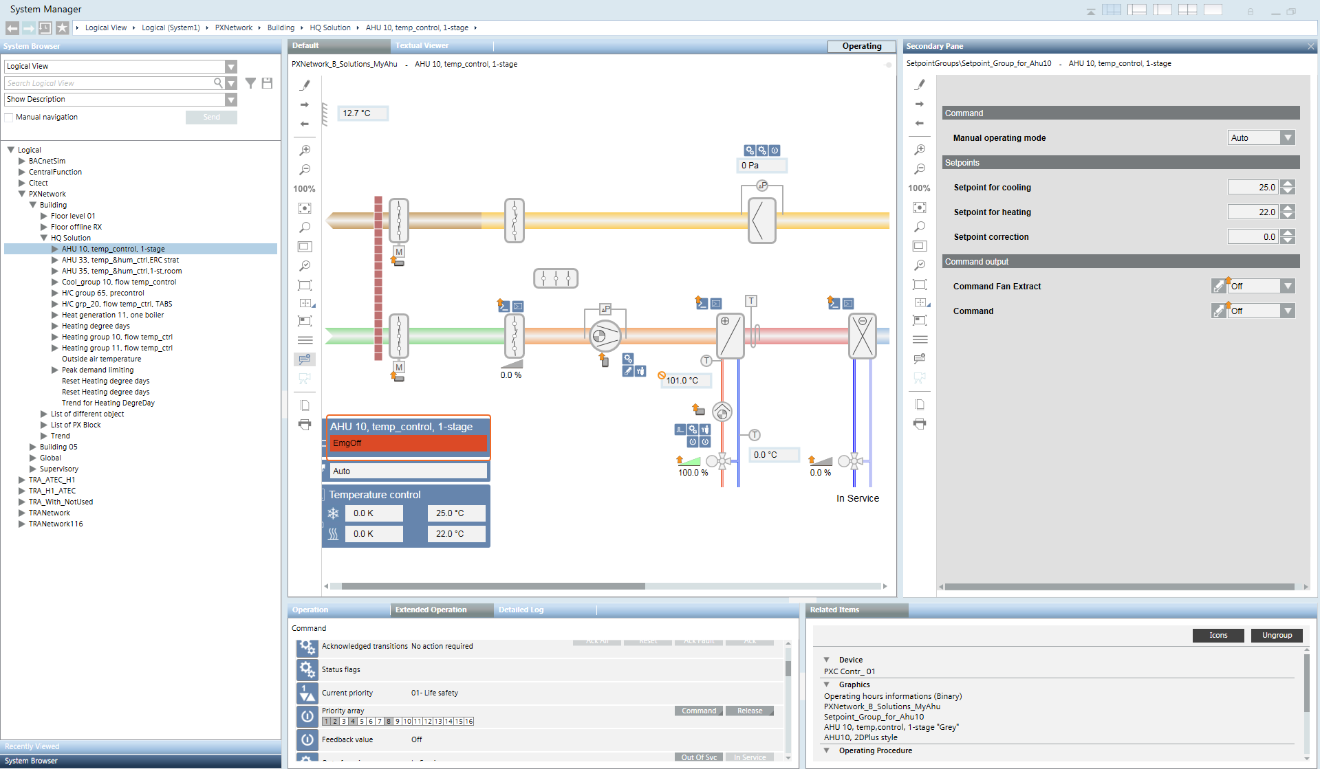 A plant operator tableau includes the most important information to control a plant. The operating state, setpoints, or output can be easily operated. NOTE: This function is not available on all projects.