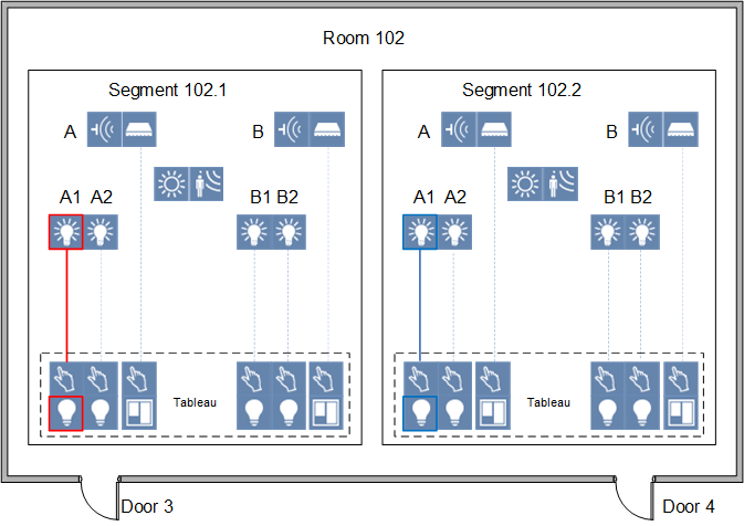 Scenario: You have a room with 2 segments. Two switches (panels) are available for each door in this room, but they can only control one room segment. But you can only control one lighting A1 from this switch. However, you want to be able to turn the lighting on and off for the entire room from both doors. To do this, you must link door 3 (red) and door 4 (blue) as well link door 4 (blue) and door 3 (red). After linking, you can switch lighting A1 (purple) from door 3 and door 4. This must occur for each of the four switches and in both directions. Any brightness and presence detectors must also be linked as per the new requirements.