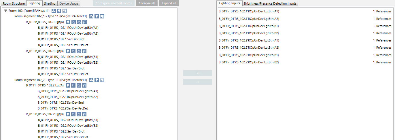 1. Highlight lighting inputs RS_102.2’ROpUnDev‘LgtBtn(A1) and Lgt RS_102.2’ROpUnDev‘LgtBtn(A2). Note that you must perform the assignment in both directions (from segment 1 to segment 2 and from segment 2 to segment 1).
