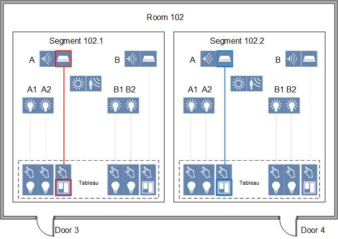 Scenario: You have a room with 2 segments. Next to each door is a switch that can only control one room segment. However, you want to operate shading up and down from both switches (A = Window, B= Skylights). To do this, you must link door 3 (red) and door 4 (blue) as well link door 4 (blue) and door 3 (red). After linking, you can switch shading A1 (purple) from door 3 and door 4. It must apply to the window blinds (A) as well as skylight shading (B). Any brightness and presence detectors must also be linked as per the new requirements.