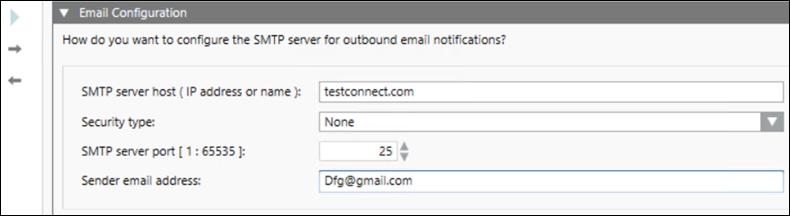 - Enter the host configuration in the SMTP server host (IP address or name) field.