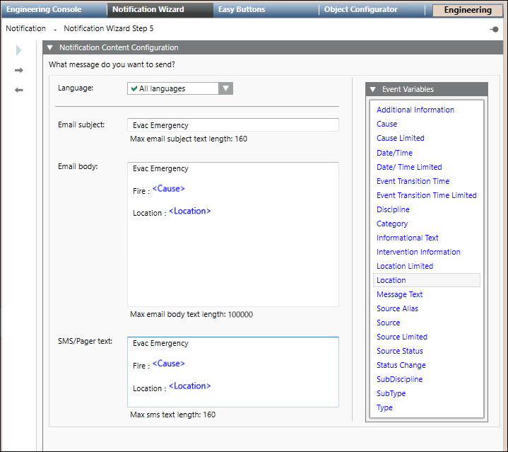 NOTE: The default text is provided for Email subject, Email body and SMS/Pager text when you select the All languages option.
