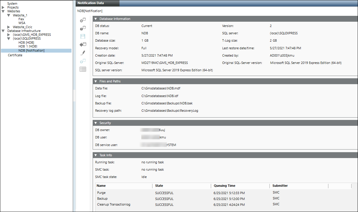 - Write permission on file MNS_DbMaintenanceService.log located under [installation drive:]\[installation folder]\GMSMainProject\Log.