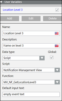 In the following example, an inbuilt sample script Notification Management View and its function MV_NF_GetLocationLevel3 is used to deliver just the third level of the location of the Management view path of the data point, which triggers a Notification. For example, if location is Project.Management System.Servers.Main Server, it will deliver only Main Server.