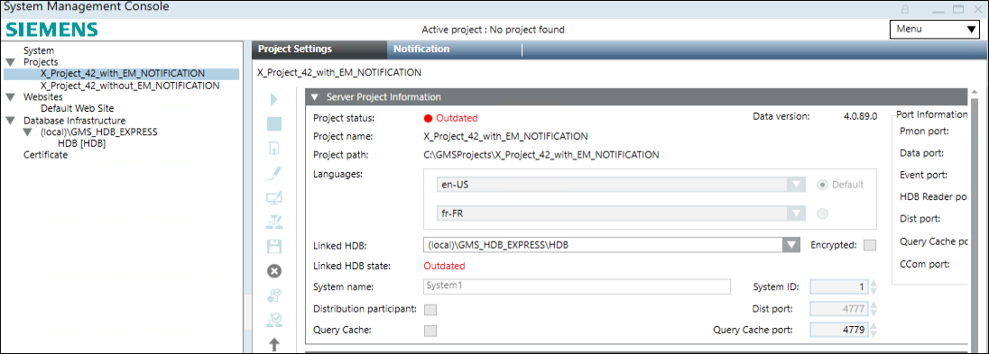 From V5.1 and onwards, project and notification database works independent. You need to upgrade V4.2/V5.0 Projects with Notification Database to V5.x and later.