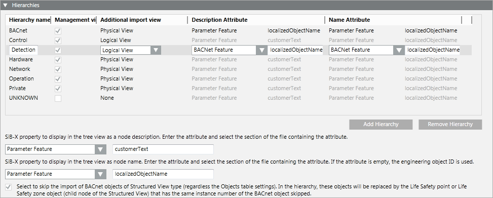 As each hierarchy can belong to more than one view, it is also possible to define the Description and Name attributes by specifying the section of the SiB-X file and the corresponding name and description. After the import of a SiB-X file this results, for example, in the object being represented by its description in the Management View and by its name in the logical view.
