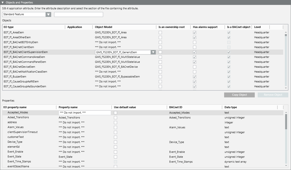 Once a SiB-X file is extracted, the Objects and Properties expander allows authorized experts to specify the objects and properties import rules (see Configure Objects and Properties for SiB-X Import Rules).
