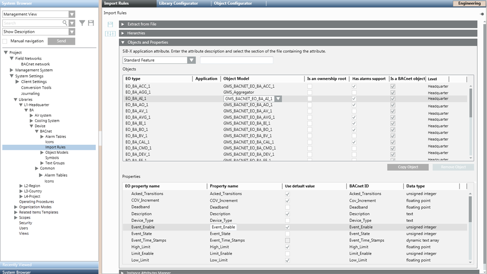It is possible to skip the import of BACnet objects of Structured View type (regardless of the Objects table settings). In the hierarchy, these objects will be replaced by the Life Safety point or Life Safety zone object (child node of the Structured View) that has the same instance number of the BACnet object skipped.