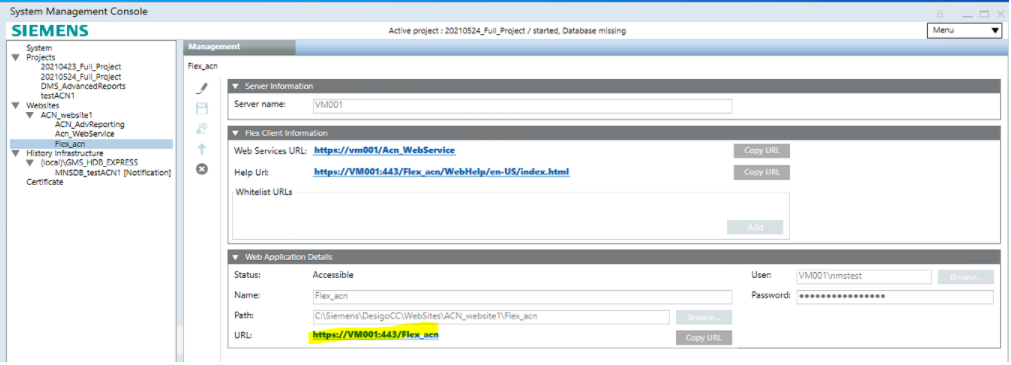 This can be the same website under which you created the web service, or a different one. The URL of the website will determine the URL of the Flex Client application that users must enter in their browsers (highlighted in yellow in the image below).
