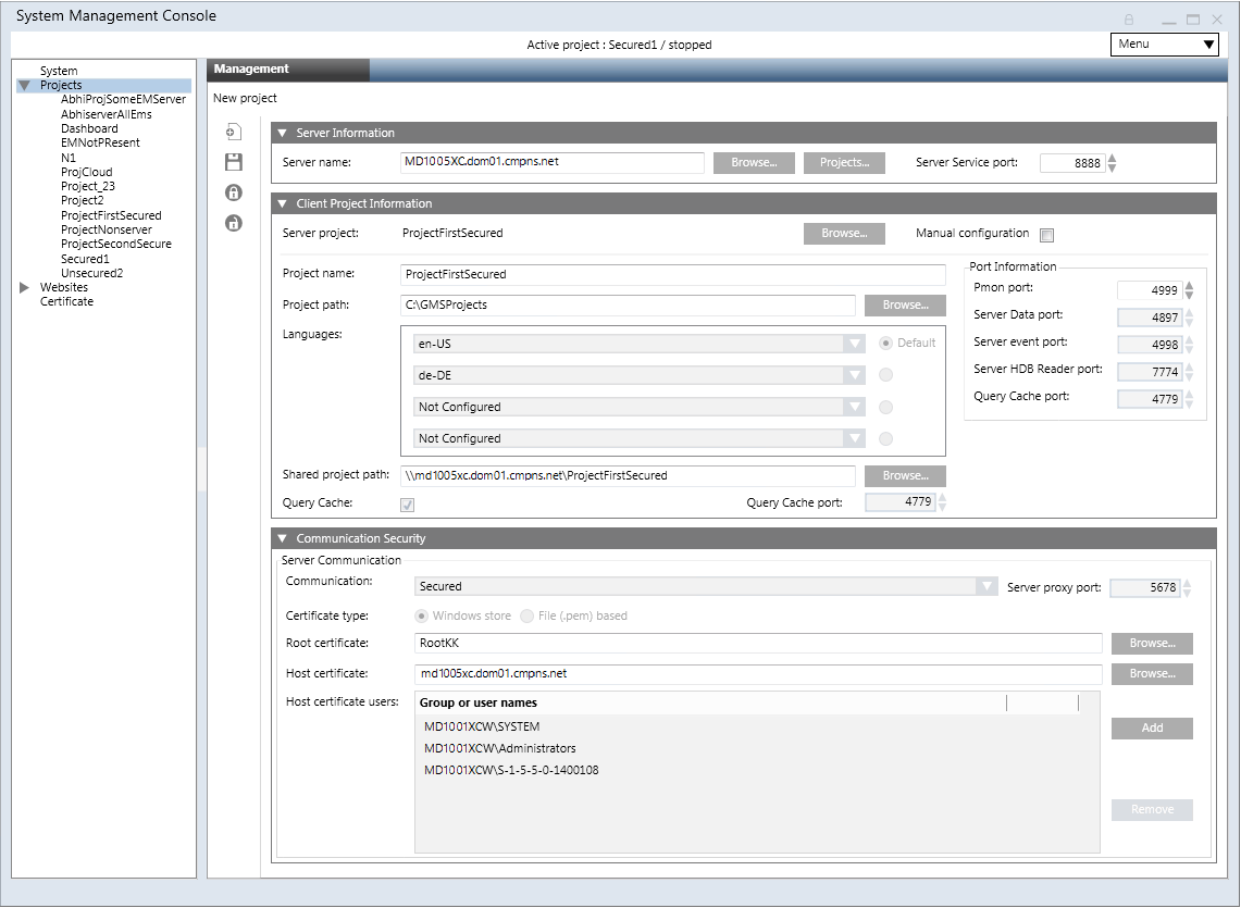 If you use a secure client/server connection, GMSDefaultUser must be included in the list of host certificate users of the project. You can configure such list in the Security expander of SMC Server.