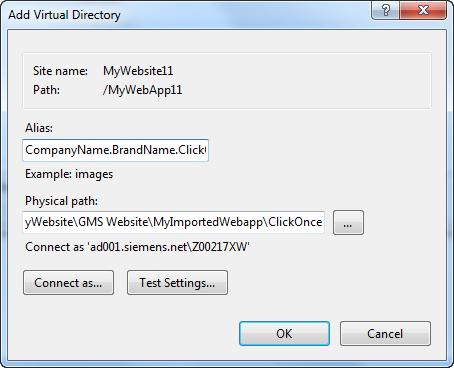 - The Add Virtual Directory dialog box displays.