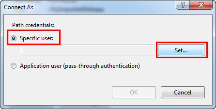 - In the Connect As window, select Specific User and click Set.