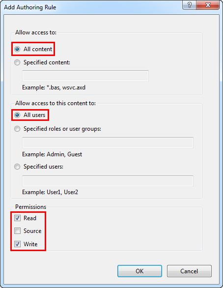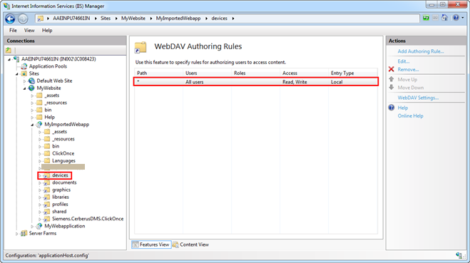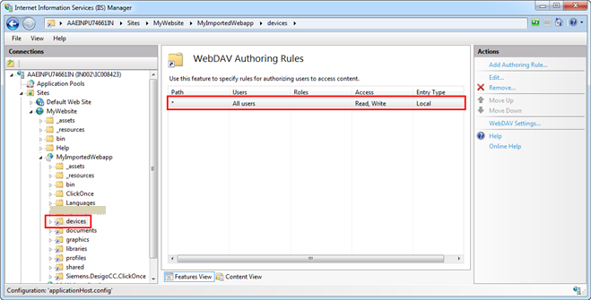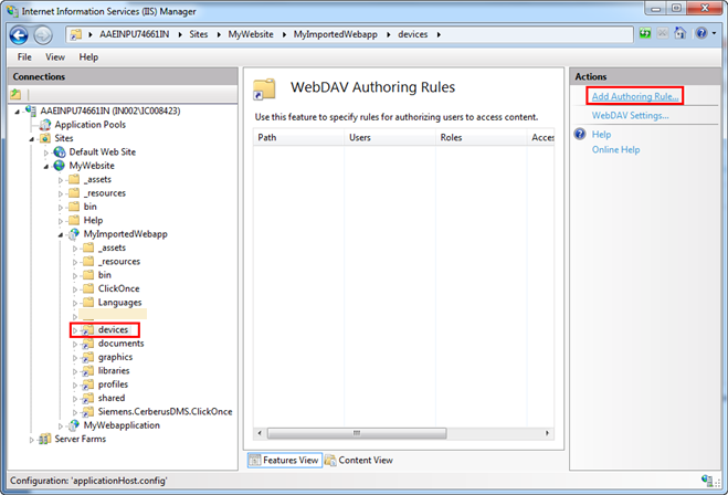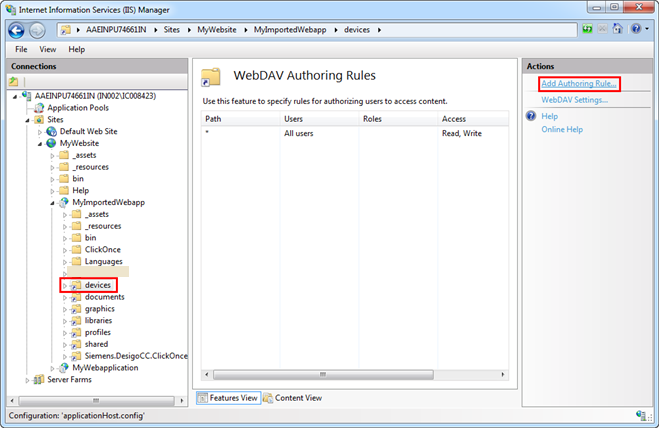 To set the permissions in the Permissions section do the following: a. Go to the path [Installation Drive]:\[Installation Folder]\GMSMainProject\_tmpGMSWebSite\[virtual directory] on the source machine. b. Open the config file. c. Check the access rights in this file. d. In the Permissions section of the Authoring Rules dialog box, select the exact permissions, Read, Source, and Write. For example, for the devices virtual directory you must open the config file located at path [Installation Drive]:\[Installation Folder]\GMSMainProject\_tmpGMSWebSite\devices and the access entry is access = rw”, where r = read, and w = write permissions. In the Permissions section of the Add authoring Rule dialog box, you must select the Read and Write check boxes.