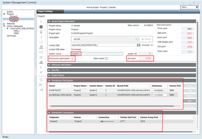 - Repeat steps 8 to 15 to set up Project3 in distribution with Project1, providing the unique dist port and adding distribution participants as projects Project1.