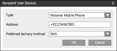 In the Recipient User Devices dialog box, from the Type drop-down list, select Personal Mobile Phone or Work Mobile Phone as a recipient device for the corresponding recipient user.