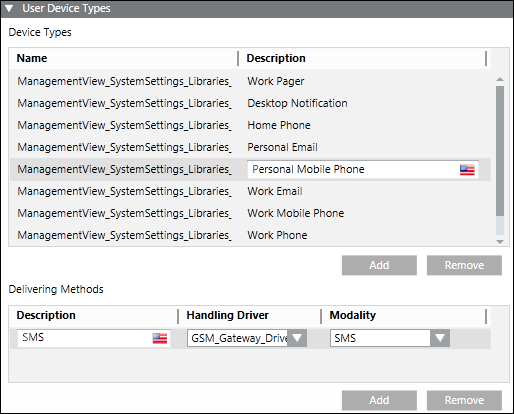 The user device type is automatically configured. In the Recipient Editor tab, under the User Device Types expander, you can see that the GSM Gateway Driver is set as the handling driver and modality is set as SMS.