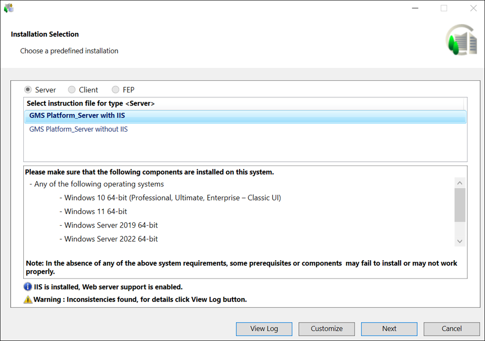 For Client/FEP installation, select the modified GMS Platform.xmlfile, available under path ...\InstallFiles\Instructions, containing setup type as Client or FEP and the extensions along with the post-installation steps that can be installed on the Setup type - Client/FEP. NOTE: Any mismatch between the GMS Platform.xml file and the software distribution is listed in the Warnings section. (See Consistency Check Scenarios). During fresh installation, installation of hotfixes or quality updates, for any errors or warnings, for example, regarding platform (GMS folder) or EM folder, prerequisites, extensions, or post-installation steps, digital signature validation, a warning message displays in the Installation Selection dialog box and you can view details by clicking View Log. For more information see, Consistency Check Scenarios.