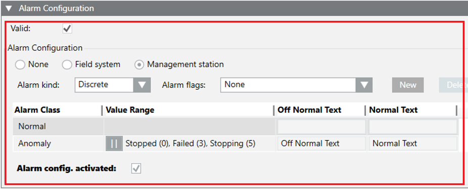 AlarmProperty | Optional | Specifies the operand and the value of the alarm condition (Value Range). In case of normal condition, this data is ignored and can be omitted. In all the other alarm conditions it is necessary to specify it. For details about the configuration, see Discrete Alarms – AlarmProperty. |