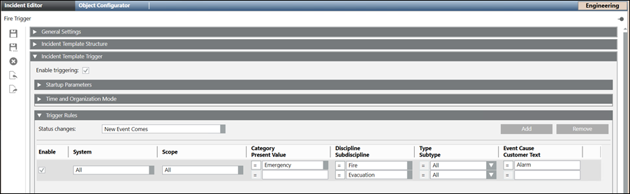 NOTE: The incident template is not saved if the Enable check box is selected and the active trigger rules are set to the default values for Scope, Category, Discipline or Subdiscipline.
