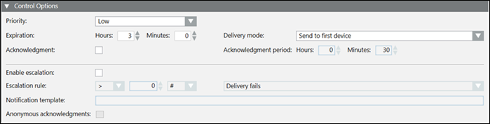 - Control Options: Configure the message priority, escalation with other details like delivery mode and expiration time.