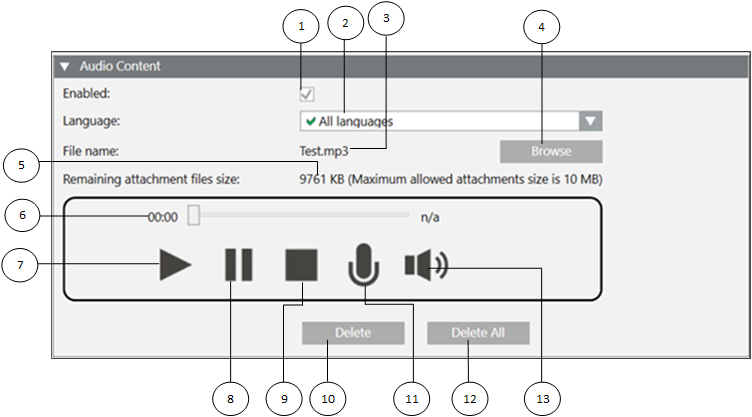 4 | Browse | Allows you to browse the local file system and upload a file as audio content. You can upload MP3 and WAV files. |