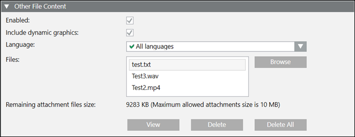 NOTE: If you select both Dynamic Graphics and static files, the sent message will contain only the Dynamic Graphics. While selecting Dynamic graphics, make sure to select the Include Dynamic Graphics checkbox. - Remaining attachment files size: The available file size is displayed in KB. You can add single or multiple files up to the maximum configured attachment size. The remaining file size of the configured limit is displayed here.