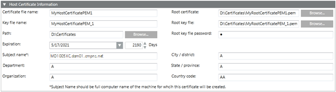 When you click Create Certificate > Create Host Certificate (.pem), the Host Certificate Information expander displays. This allows you to create a .pem host certificate.