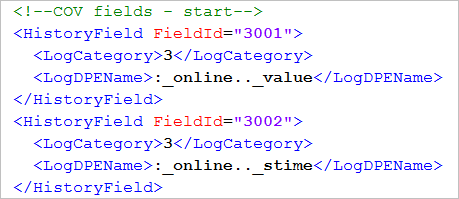 - Depending on the type of event (Alarm, Action, or COV), the information corresponding to the <LogDPEName> tag in the <HistoryField> tag displays.